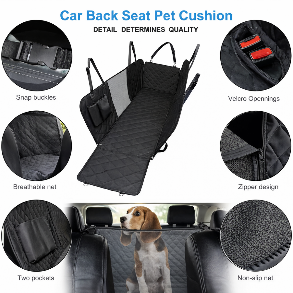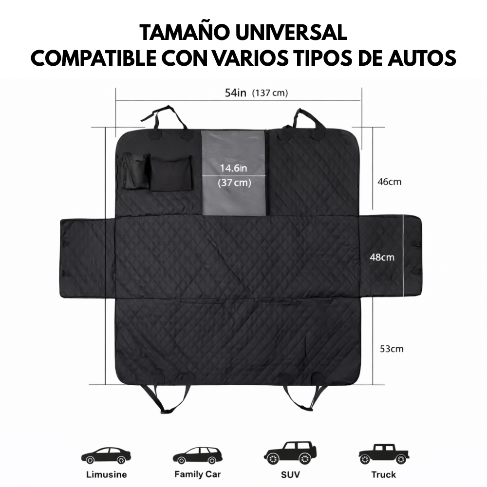 Mantén el asiento trasero de tu auto impecable mientras brindas máxima comodidad y seguridad a tu mascota con el Cobertor para Asiento de Auto Negro 137 x 147 cm. Diseñado con materiales resistentes y detalles funcionales, este protector cubre completamente el asiento, respaldos y laterales, evitando pelos, manchas, arañazos y suciedad. Su diseño acolchado tipo diamante no solo aporta un acabado elegante, sino también mayor confort en cada viaje. Ideal para paseos diarios o viajes largos, es práctico, seguro y fácil de instalar.