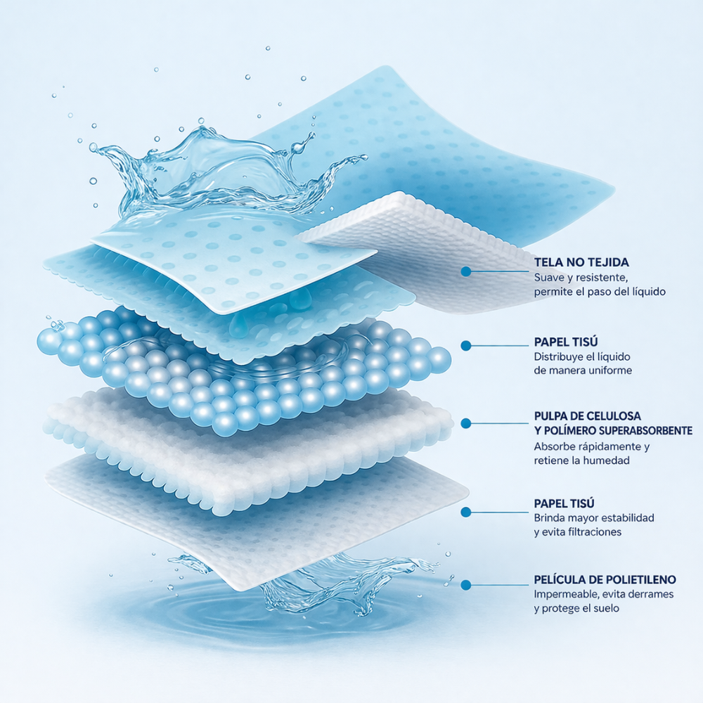 Alta absorción multicapa: Núcleo con pulpa de celulosa y polímeros súper absorbentes que retienen líquidos al instante.